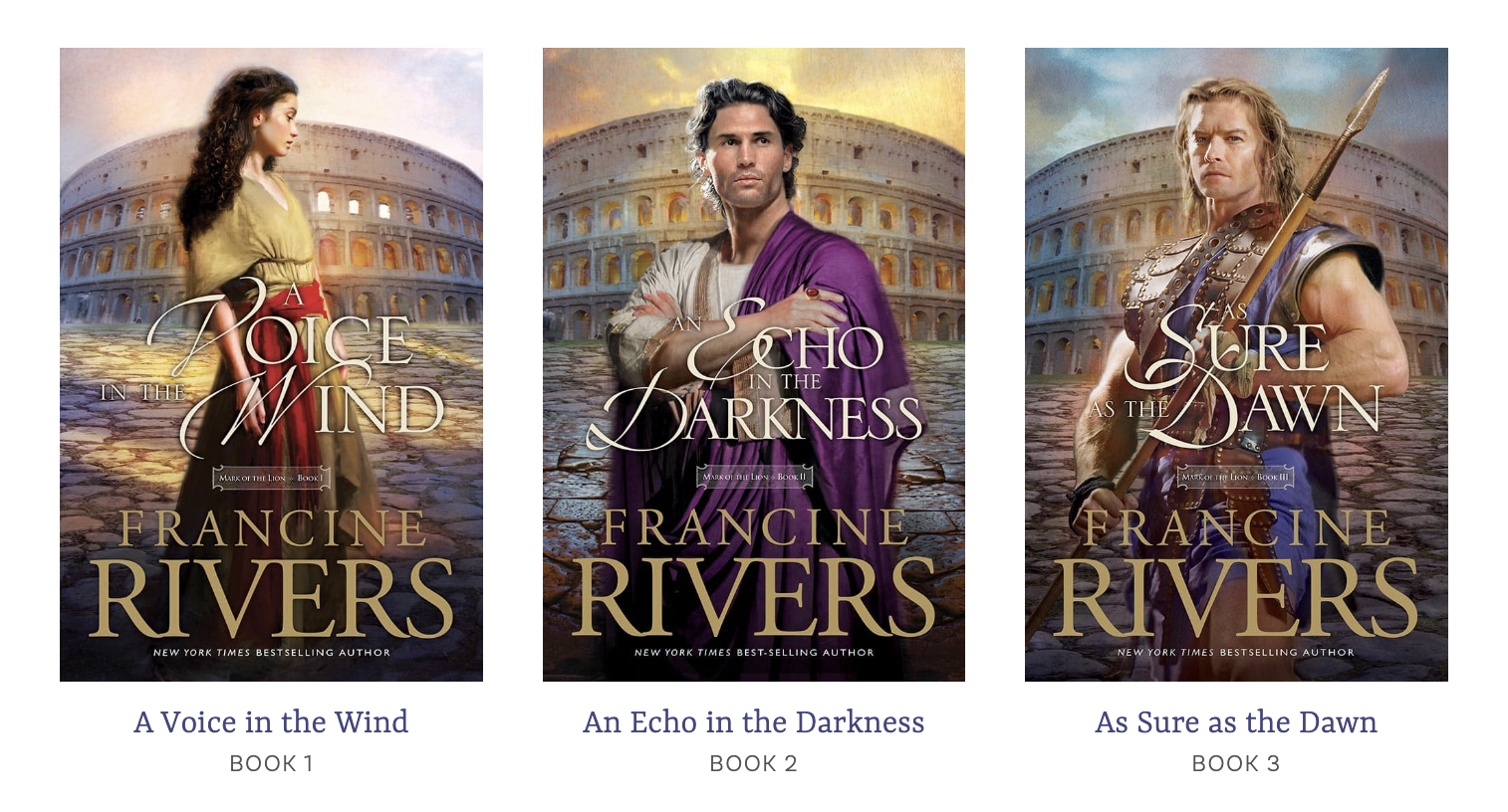 Set mainly in 1st century Rome and Ephesus, this is a story of courage, faith, forgiveness, and redemption. The main characters include Hadassah, a young girl captured during the siege of Jerusalem in 70 AD and sold into slavery; the Valerians, a wealthy and aristocratic Roman family; and Atretes, a German warrior captured and trained as a gladiator. In addition, the author weaves in a whole host of other characters including several from the Bible, fictionalized of course.