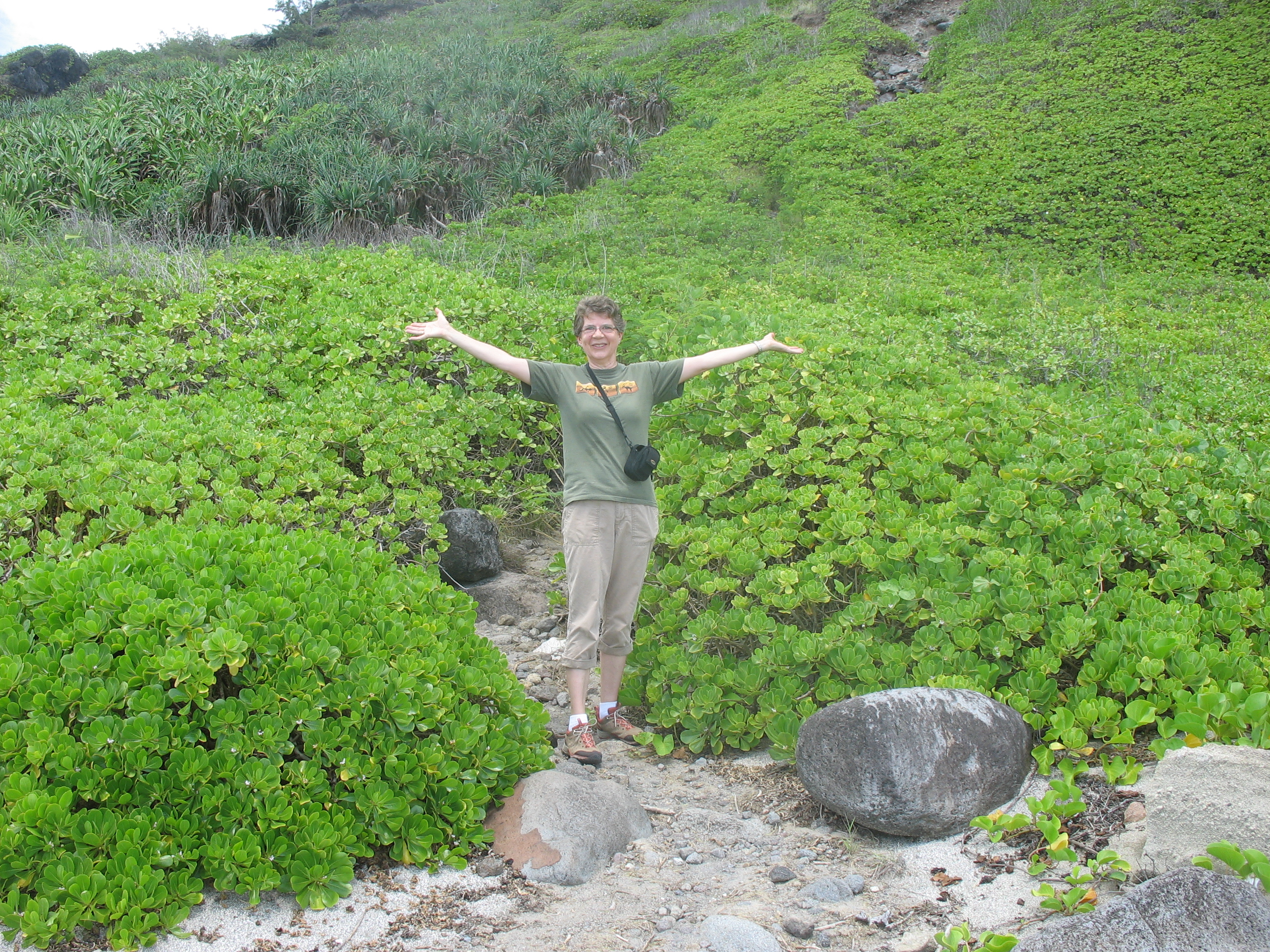The sign at the trailhead, a short distance from the viewpoint, called this a strenuous hike and said that it would take 45 minutes in each direction. It was a fairly steep climb down through the bushes, across a ridge and down a dry watercourse but the only reason it actually took us 45 minutes is because we stopped so often to enjoy the views and take pictures. I’m super glad that I bought a brand new pair of Merrell walking/hiking shoes just before we left Canada and brought them with me. They’re really comfortable and I feel as sure footed as a mountain goat wearing them.