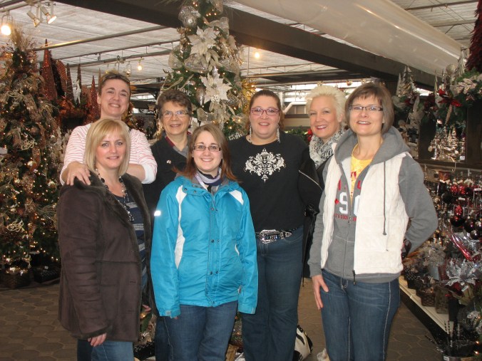 On Saturday morning, we try to be in the parking lot of Greenland Garden Centre in northeast Edmonton when the doors open at 9:00 a.m. At this time of year, Greenland is transformed into western Canada’s largest Christmas store. Whether or not we buy anything, we all love spending time there soaking up the ambiance and getting in the mood for a full day of Christmas shopping. We also pose for our annual photo in front of one of their gorgeous trees. There’s always a staff member willing to oblige and act as our photographer. One year when there were only three of us, we even had staff members stand in for regulars who were missing!