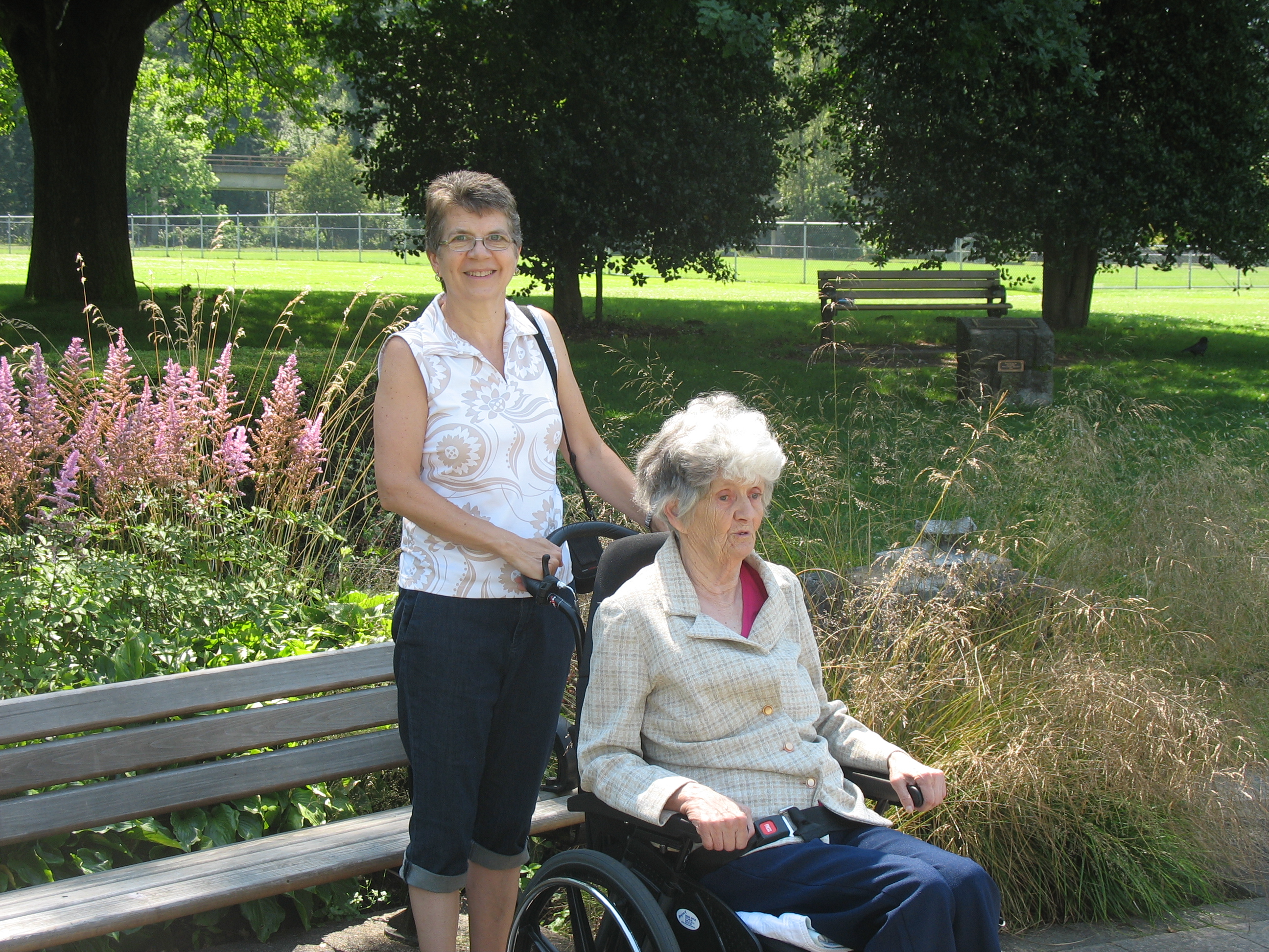 Over the ensuing years, the mother that I grew up with has disappeared and parent has gradually become child. It has been a fairly slow decline. Many times, Mom would seem to slip very noticeably and then plateau for a time giving us a chance to get used to the changes before more drastic ones surfaced. Unfortunately, Dad seemed to be in denial for the longest time making it impossible for us to discuss the situation with him or to be of much help. It’s only in the last year that Mom’s condition has been clearly identified as Alzheimer’s disease and that we’ve been able to talk about it openly. The situation is made worse by the fact that my sister, my younger brother and I live in Alberta while Mom and Dad are here in Vancouver. Only our older brother, mentally handicapped and himself living in care, and our oldest son Matthew are here at the coast. We really can’t saddle Matthew, in his second year of a law career, renovating a house and parenting two very young children with the responsibility of watching out for his elderly grandparents. He and Robin visit as often as they can and do their best to keep us informed of any changes or problems that they notice.